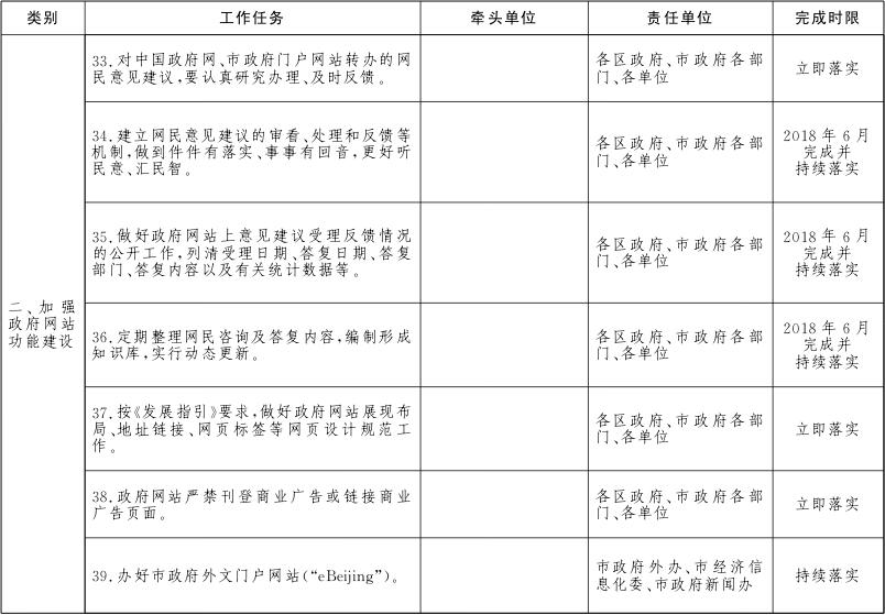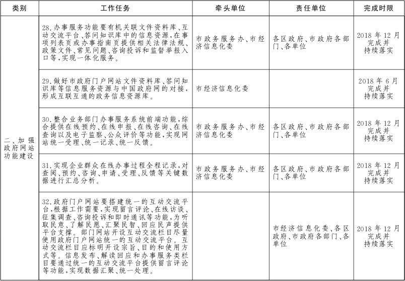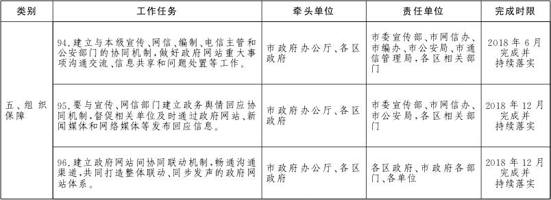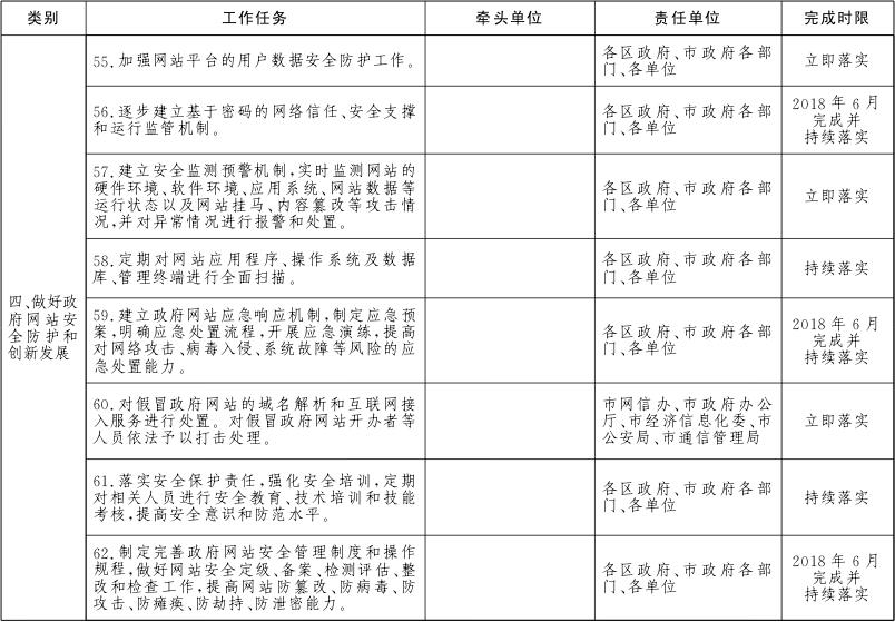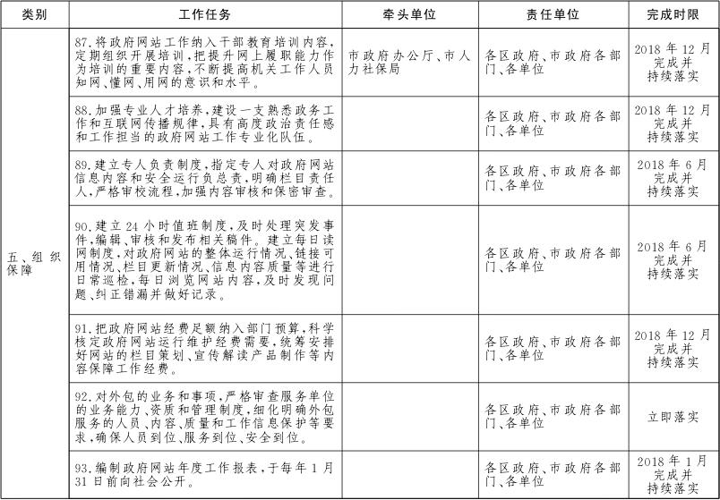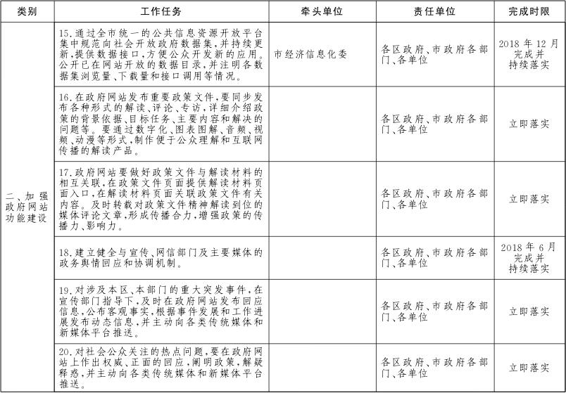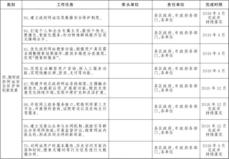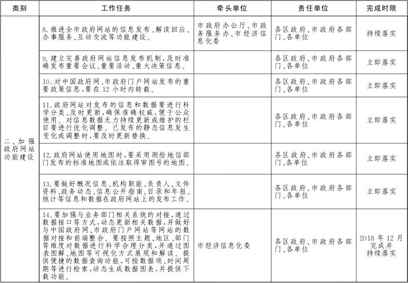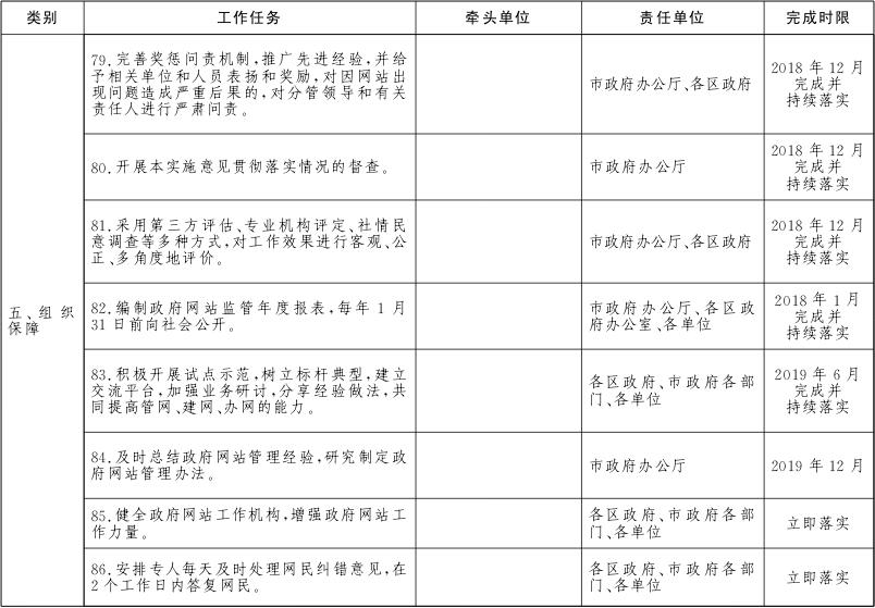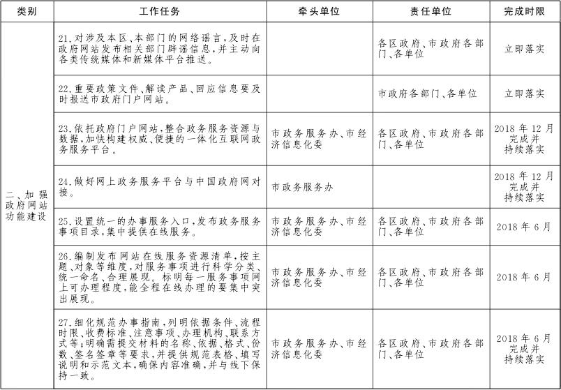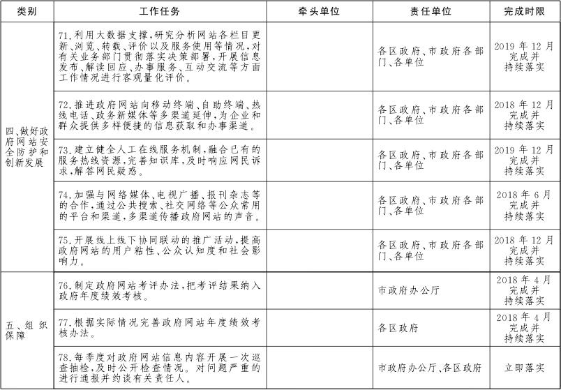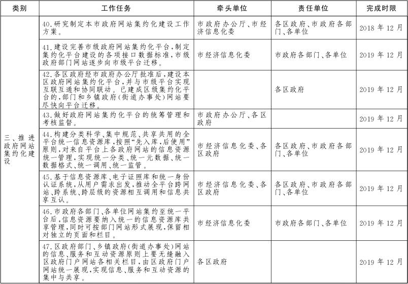 各区政府、市政府各部门、各单位要对本地区、本部门、本单位及本系统的政务服务网、公共资源交易网、数据开放网等各类网站进行全面梳理,摸清底数。2018年6月底前完成市政府各部门、各单位政府网站的规范整合工作,2018年12月底前完成区级及以下政府网站的规范整合工作。